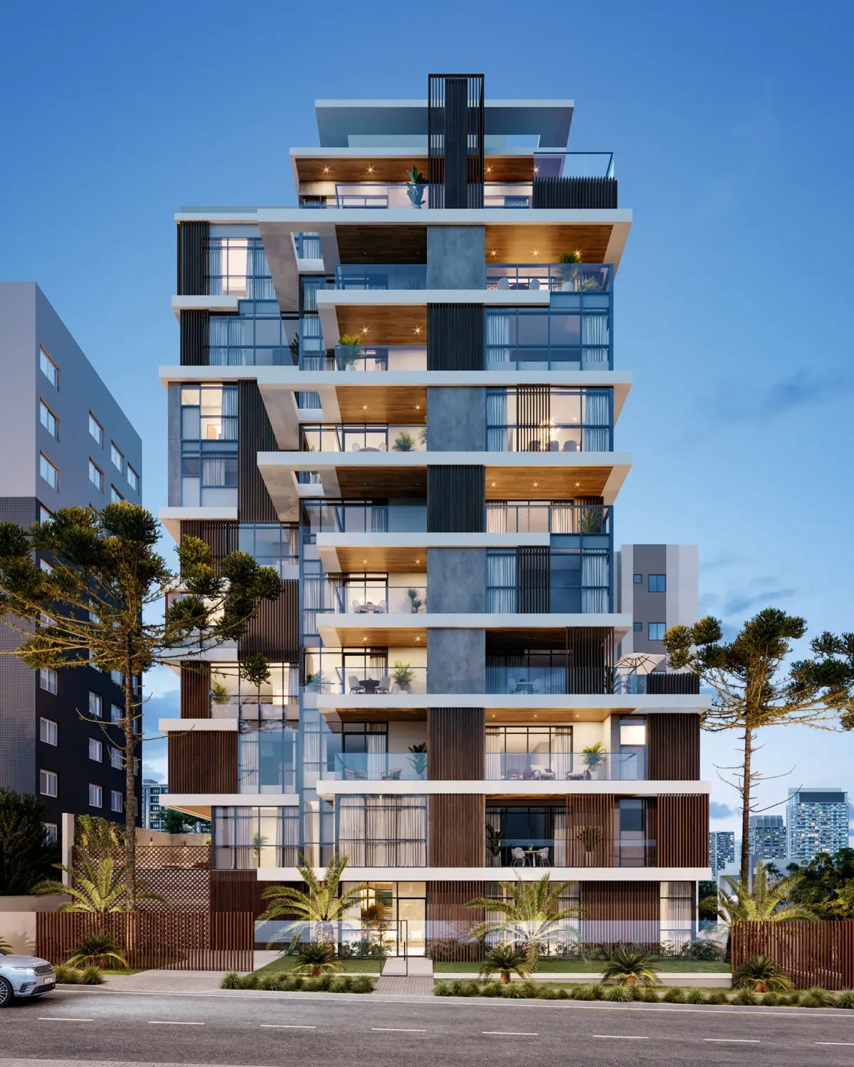 O projeto impressiona pela estética e a fachada moderna dialoga com o entorno tradicional do Batel, enquanto o uso de materiais nobres reforça o conforto e a atemporalidade.