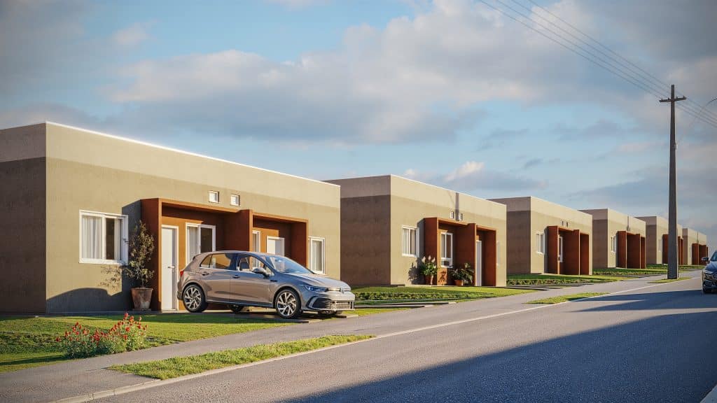 As casas são térreas, com dois quartos, quintal privativo e vaga de garagem. Algumas unidades, inclusive, podem ser adaptadas para pessoas com deficiência, o que amplia a acessibilidade do projeto. Há versões geminadas e não geminadas, oferecendo mais liberdade de escolha para cada perfil de família.